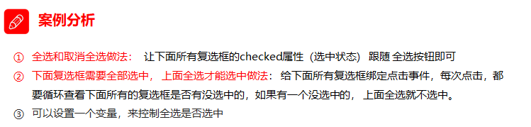 // 1. 全选和取消全选做法: 让下面所有复选框的checked属性(选中状态) 跟随 全选按钮即可