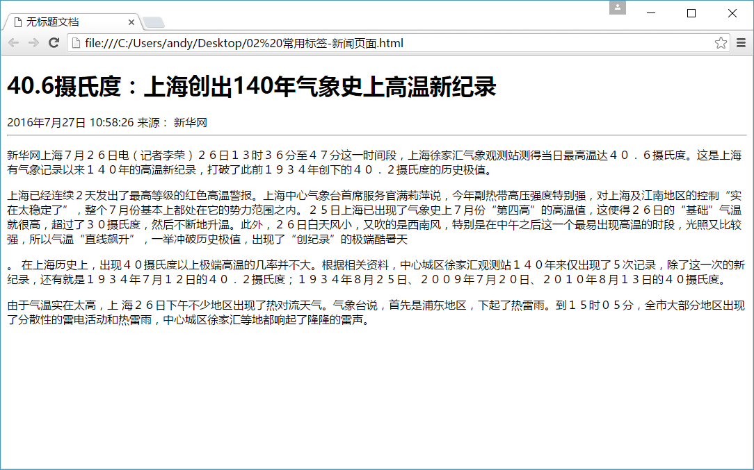 是HTML文档中最常见的标签,默认情况下,文本在一个段落中会根据浏览器窗口的大小自动换行。