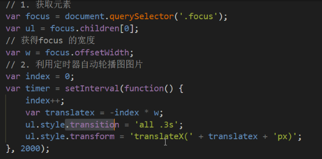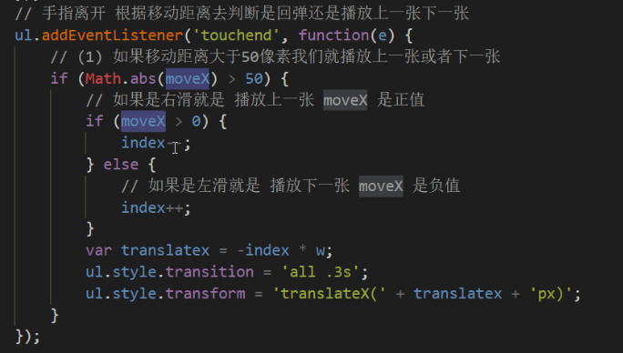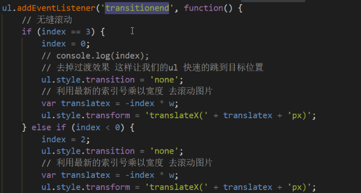 注意,我们判断条件是要等到图片滚动完毕再去判断,就是过渡完成后判断
